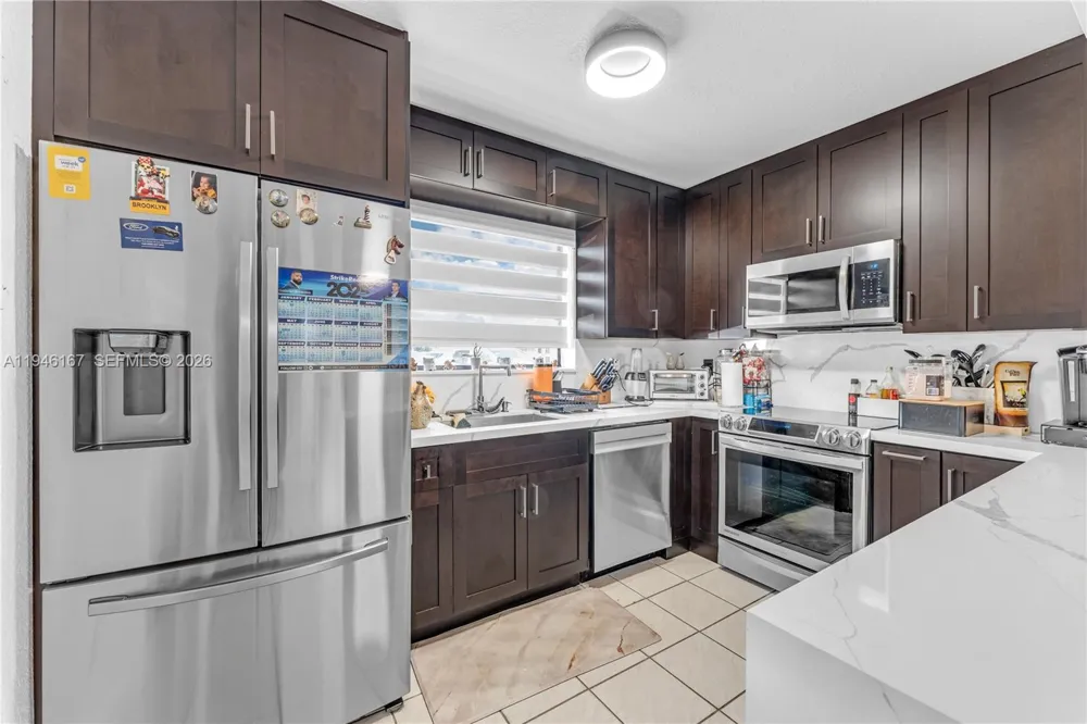Beautifully upgraded Camelot townhome featuring 3 bedrooms and 2 remodeled en-suite baths upstairs, plus a discreet guest bath downstairs and two comfortable living areas. The standout is the newly renovated eat-in kitchen (over $25K spent) with breakfast bar seating and a white waterfall countertop, paired with all 2024 appliances; including the AC and washer/dryer. This is the only unit in the community with extended AC ducts and additional vents, designed to solve the common hot master-bedroom issue. Also the incredible custom closet, crafted strictly for Royalty. Enjoy two balconies, a screened patio for relaxing outdoors without mosquitoes, and a private gated front porch that’s great for pets. The home is located directly in front of the community pool and is also one of the closest units to its parking spot, so you won’t be caught far in the sun or rain. Camelot’s location is one of its greatest perks. Just about half a mile east you’ll find a pizza place, Meat Market, gas station, car wash, dry cleaners, dog groomers, and nightly food trucks—plus Calusa Park steps away. Head the same distance south to King Meadows Park for adult basketball courts or fishing on a peaceful lake. You’re also minutes from major shopping hubs: Hammocks Town Center is under 2 miles away, and Kendale Lakes Plaza is even closer. Police station down the street. This home blends modern upgrades, comfort, and everyday convenience in one of the best-situated spots in the community.